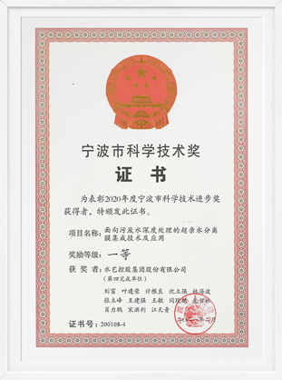 寧波市科學(xué)技術(shù)獎(jiǎng)證書-面向污廢水深度處理的超親水分離膜集成技術(shù)及應(yīng)用(水藝控股集團(tuán))
