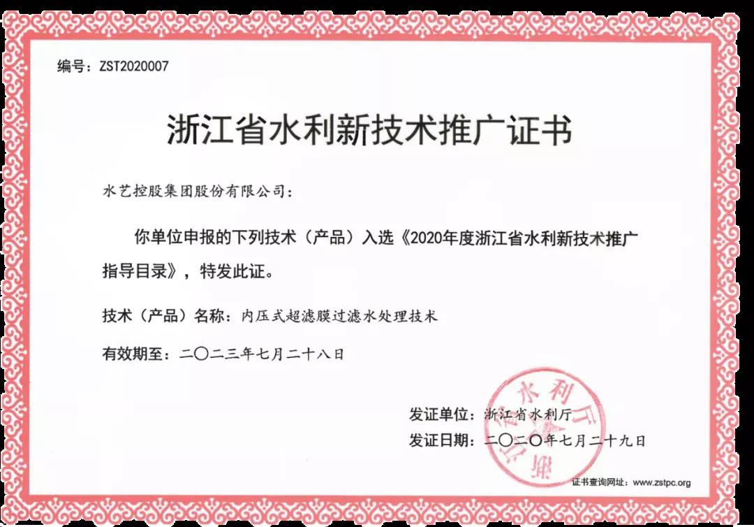 2020年,“Slufri-MBR一體化高效生物反應(yīng)器”與“中空纖維膜超濾凈水設(shè)備”系列產(chǎn)品通過(guò)中國(guó)質(zhì)量認(rèn)證中心(CQC)“中國(guó)環(huán)保產(chǎn)品認(rèn)證”。與此同時(shí),“Slufri-MBR一體化高效生物反應(yīng)器”通過(guò)了中國(guó)環(huán)境保護(hù)產(chǎn)業(yè)協(xié)會(huì)(CCAEPI)"中國(guó)環(huán)境保護(hù)產(chǎn)品認(rèn)證”。七月,水藝內(nèi)壓式超濾膜過(guò)濾水處理技術(shù)入選《2020年度浙江省水利新技術(shù)推廣指導(dǎo)目錄》。