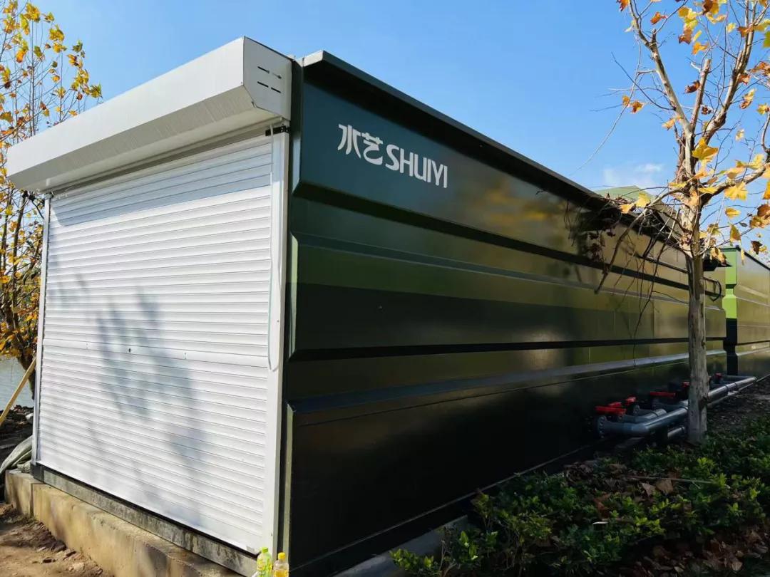 此次安裝的初期雨水設(shè)備,采用的高效脫氮-超速凈化增氧裝備一體化污水處理工藝。由水泵將河水由提至高效生化脫氮一體機內(nèi),通過高效生化一體機內(nèi)的大量的馴化細(xì)菌,在兼氧、好氧微生物的新陳代謝作用下,去除污水中的各類污染物。然后將生化出水注入超速凈化一體機,與除磷及絮凝藥劑充分混合,后經(jīng)沉淀作用使泥水分離,污泥進(jìn)入污泥池脫水減量化后外運處置。為節(jié)約空間、減少運行成本,此次設(shè)備采用一體化設(shè)備模塊式處理,在外觀上這兩臺設(shè)備更像兩個鐵皮箱,并對降低噪音作了優(yōu)化處理。